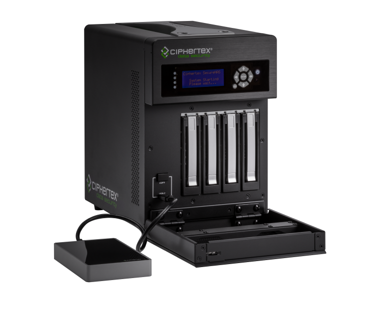 The SecureNAS can connect and share data to multiple devices simultaneously via ethernet network or USB Quick-Link® connection. All Ciphertex appliances are universally compatible with industry standard networking and computing devices.
